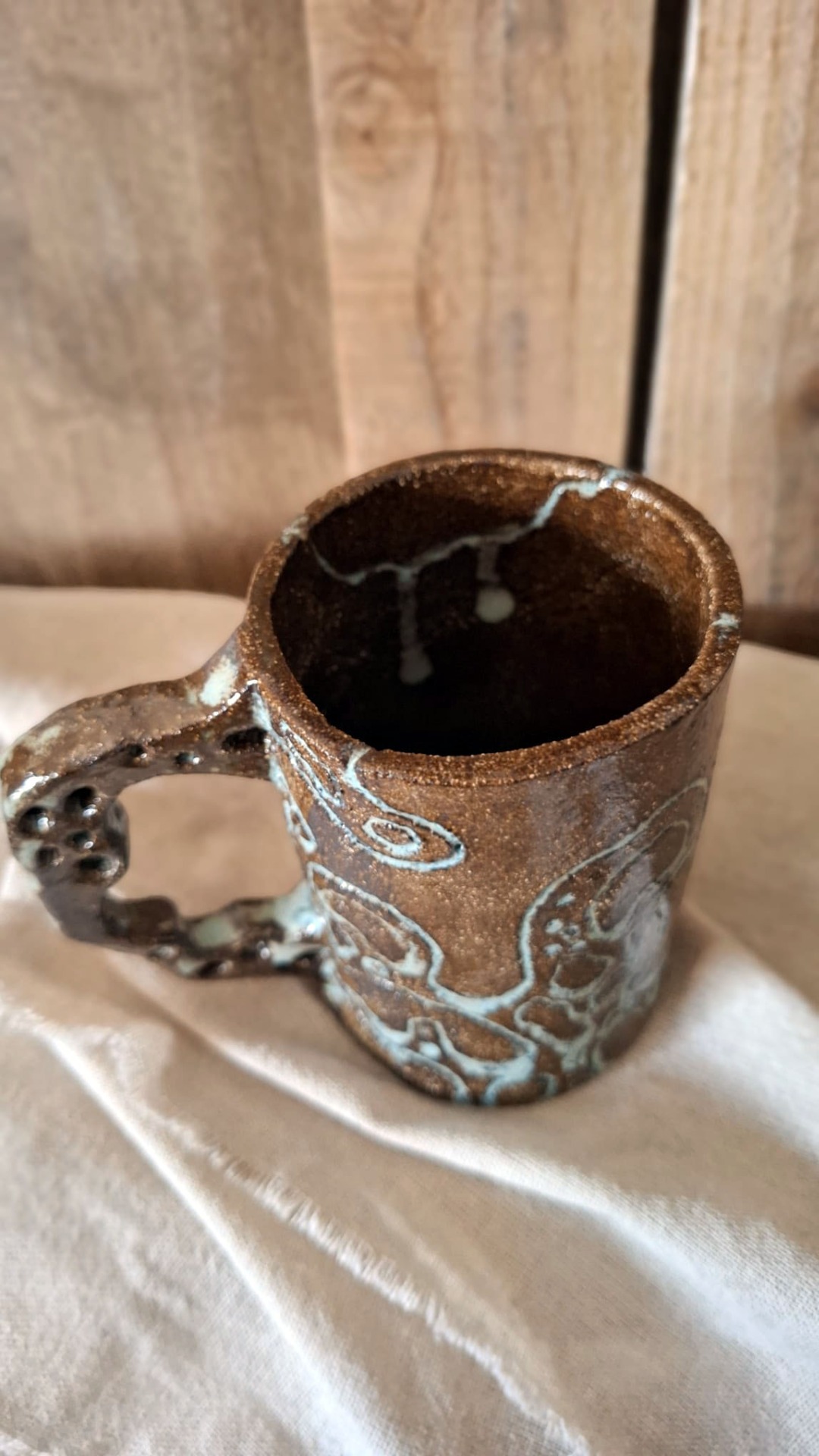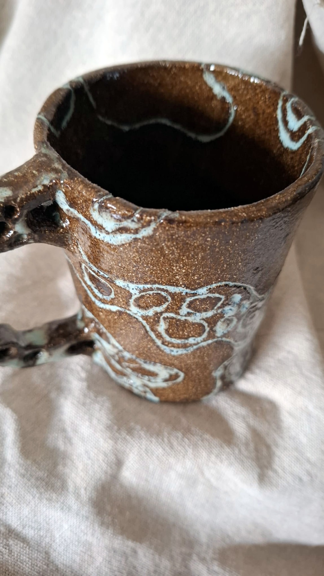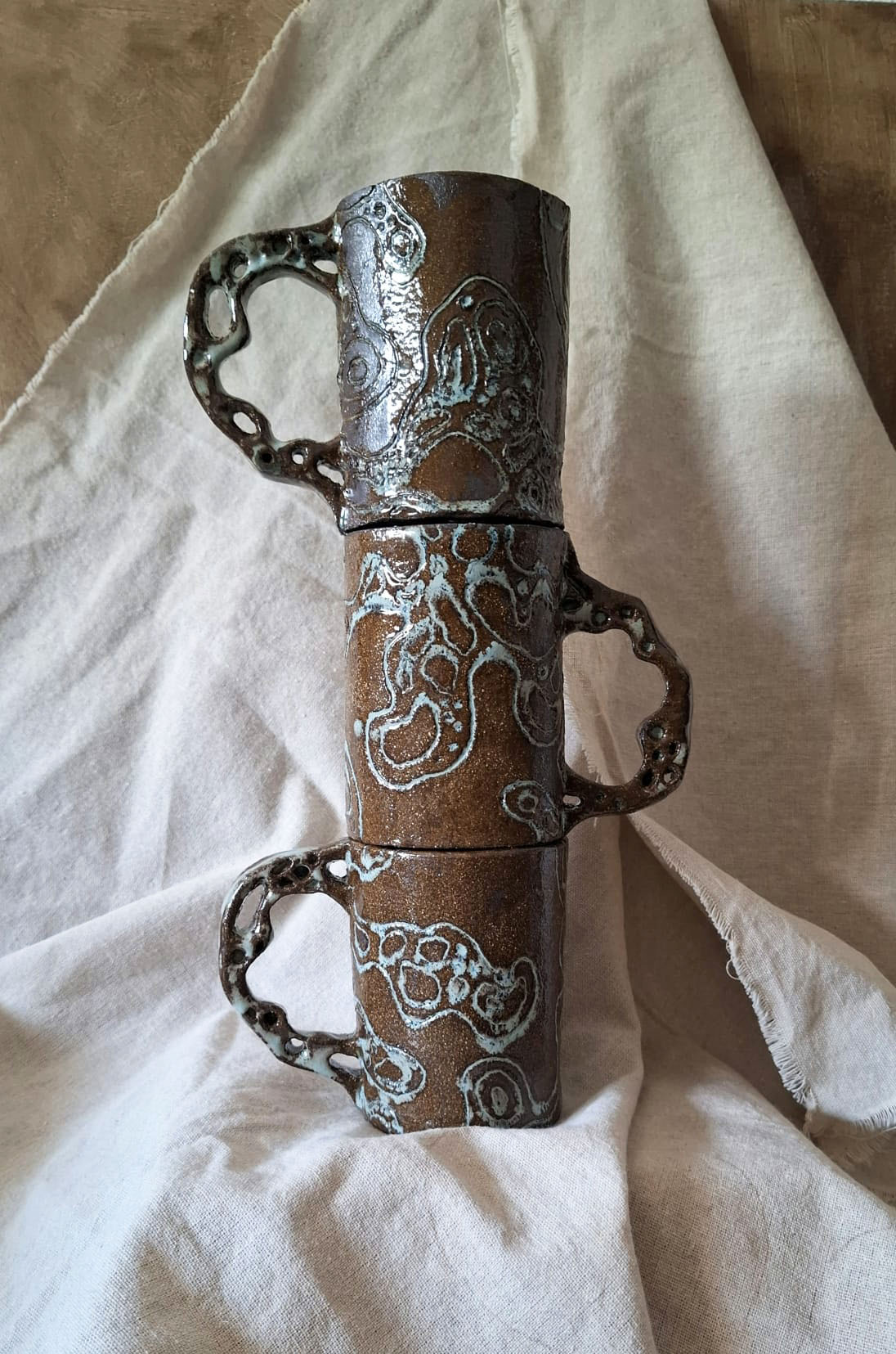 em ligações.. a molécula, para chá, café ou para o que quiseres!feito a mão em grés escuro e texturizado. vidrado de transparente e pormenores em azul.altura: 10,5cmdiamtero: 8 cmlargura: 11cm
