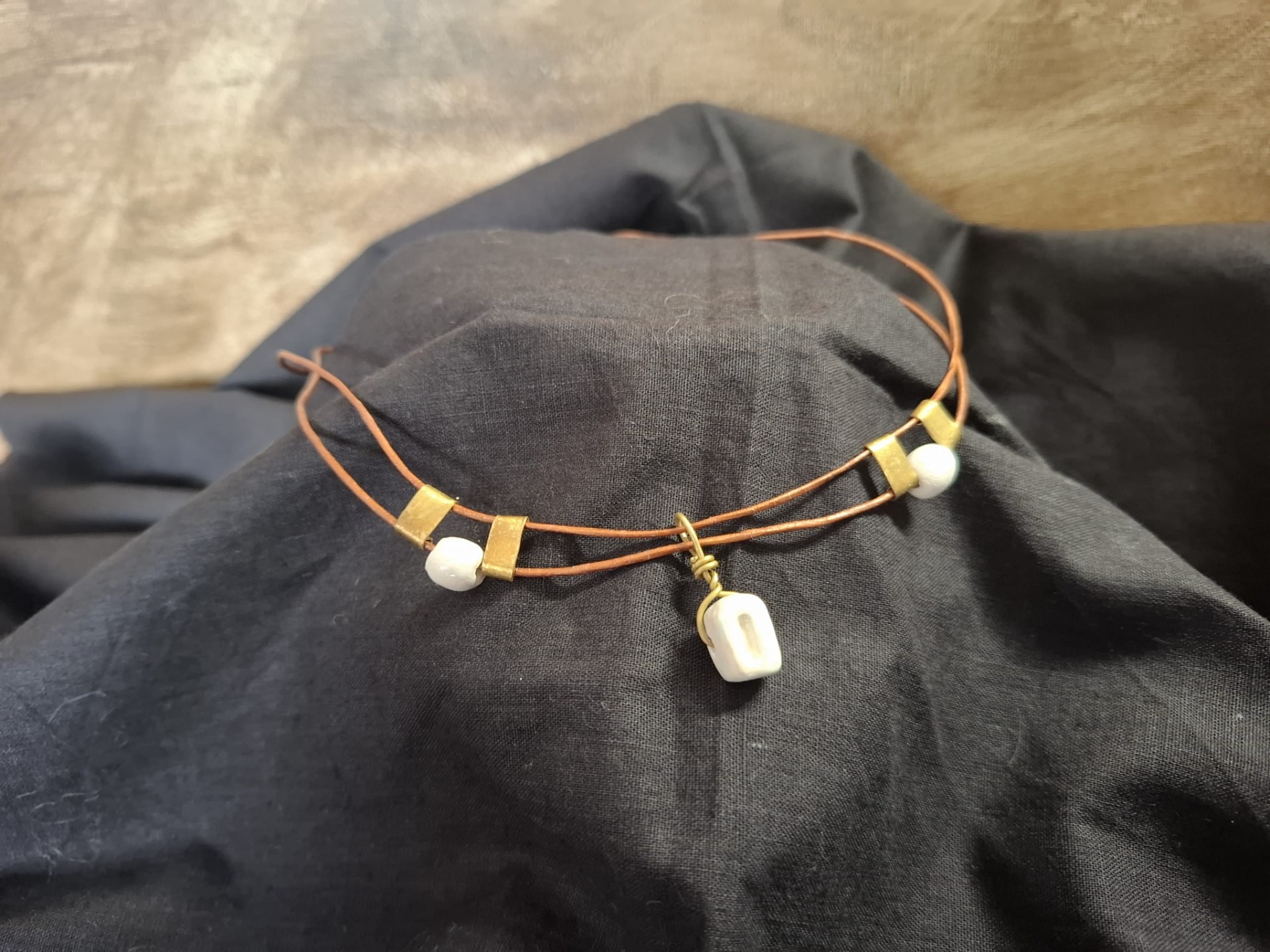 Contas de cor branca, fio de couro tingido de cor cobre e apliques e fecho em latão.